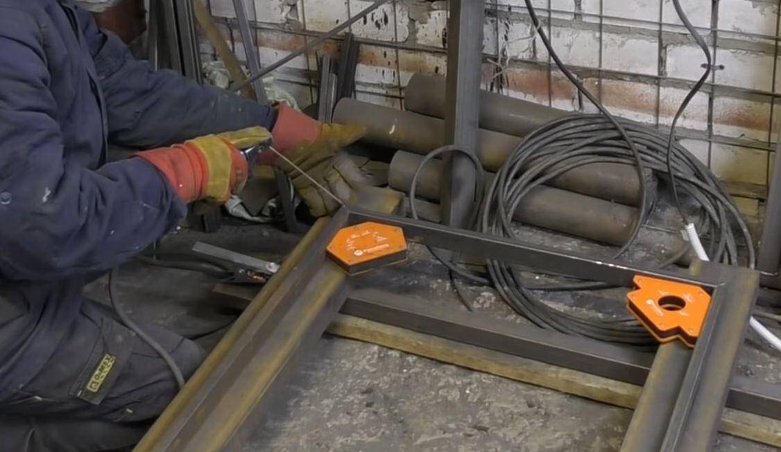 Для обеспечения жёсткости конструкции посредине рамки нужно приварить поперечину из той же квадратной трубы. Горизонтальность поперечной перемычки следует проверить при помощи уровня.