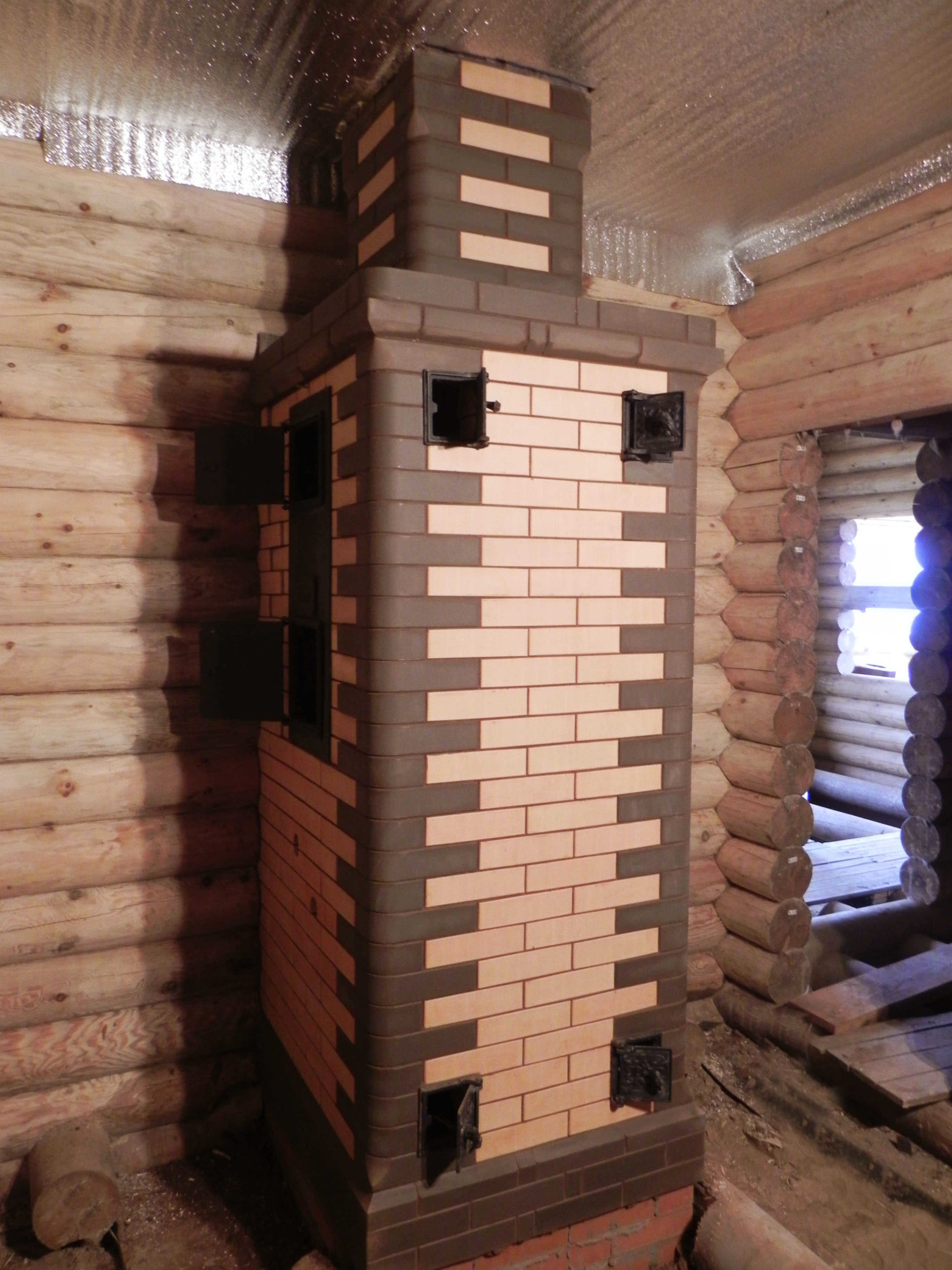 Про материалы отделки все понятно. Помимо плитки можно использовать штукатурку, побелку, покраску и декоративную жаростойкую глину. Это поможет украсить скучную печку и выделить ее на фоне интерьера банного помещения. Выполнять отделку плиткой или другими материалами необходимо только после полного застывания раствора, фиксирующего камни.