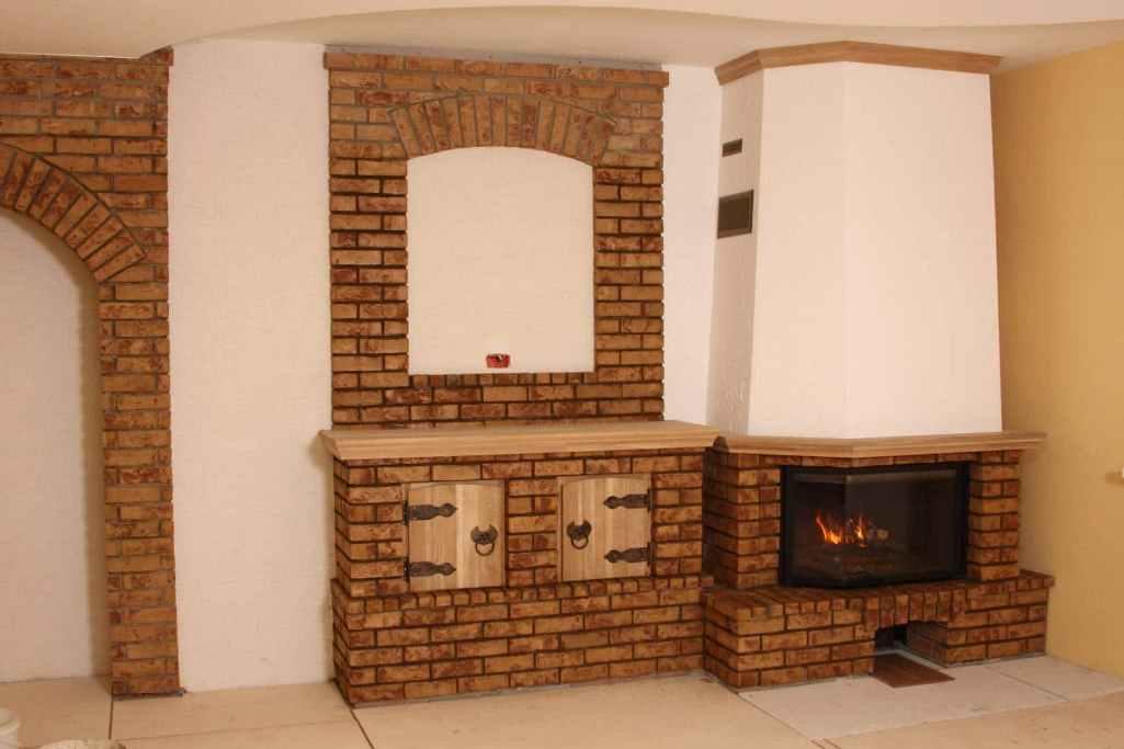Отлично в интерьере будет смотреться каминная топка, которая отделана кирпичом