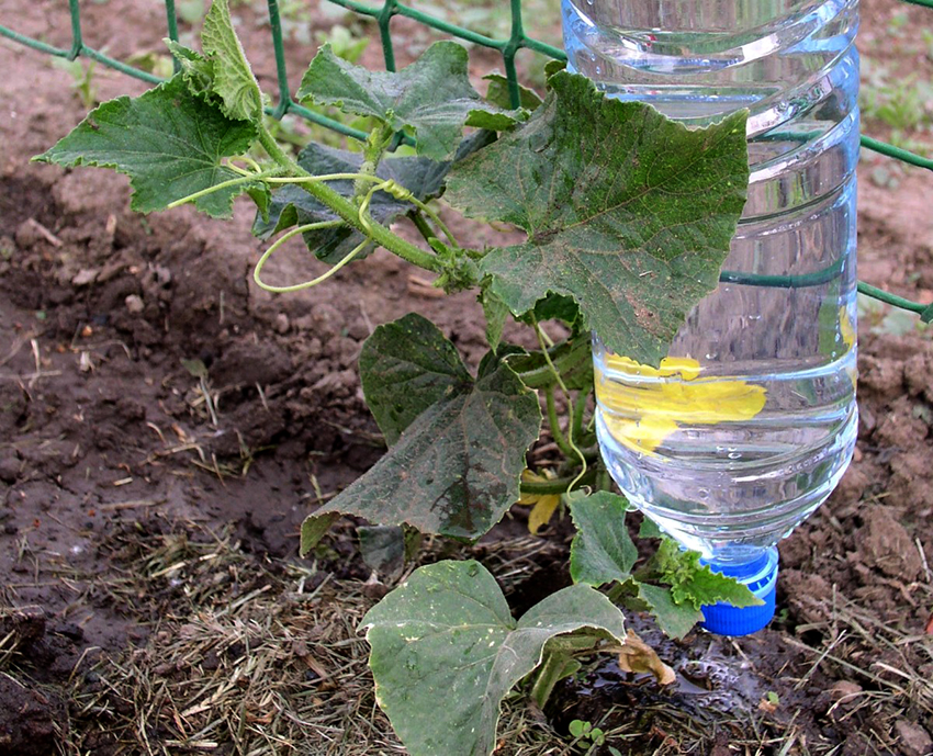 Оптимальной тарой для капельного полива огурцов в теплице считаются бутылки объёмом 2,0-5,0 литров.