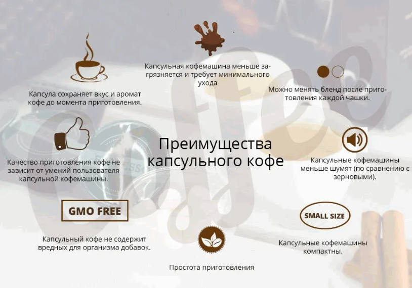 Главный плюс капсул — простота и скорость приготовления. Вам не нужно самостоятельно обжаривать и перемалывать зерна, доводя их до нужной кондиции, угадывать пропорции робусты и арабики, взбивать пенку для капучино и прочее. Принцип простой: берете готовую капсулу с точно выверенным рецептом, вставляете в кофемашину и ожидаете несколько секунд, пока приготовится порция любимого напитка. Значительно экономит время, что особенно актуально сонным утром, когда ничего не успеваешь.
