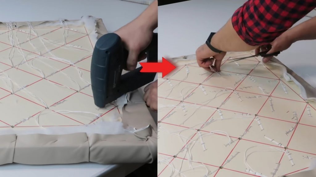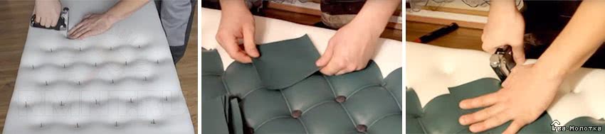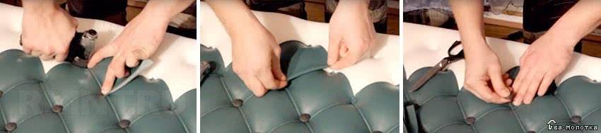 Сперва пристреливаются зубья полосы верхнего ряда, затем на них с одинаковым нахлестом укладывается квадратный элемент и пристреливается его нижний угол. Края нужно подогнуть один раз и выровнять линии складок, затем пристрелить левую и правую стороны. В завершении вырезается излишек ткани на верхней угловой складке, угол фиксируется скобой и устанавливается следующий элемент. После того как выемка полностью сформирована, в нее забивается обивочный гвоздь с широкой декорированной шляпкой.