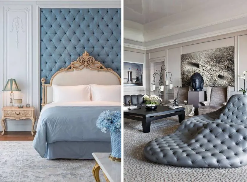 Каретная стяжка способна вписаться в любой современный интерьер, ведь для ее изготовления можно использовать самые разные ткани или кожу. Принцип выполнения капитоне один – используется стягивающая стёжка, но по результату (внешнему виду) выделяют две ее разновидности: