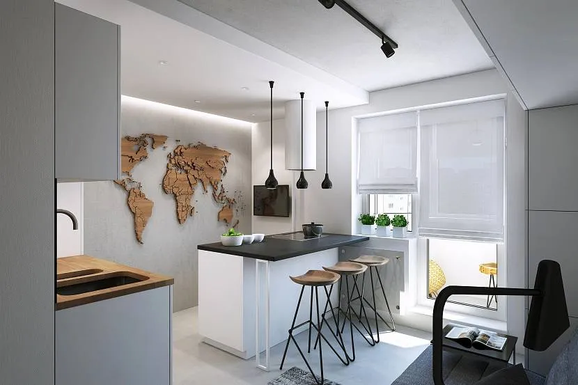 На кухне или в столовой тоже можно найти применение географическим картам. Подчеркнут самобытность дизайна рулонные шторы с напечатанным рисунком в виде континента: