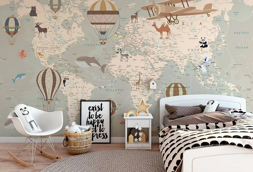 В декоре детской комнаты картографические фотообои станут настоящим пособием по окружающему миру для детей любого возраста. Они будят воображение, и поэтому особенно полезны для развития когнитивных способностей ребенка. Поэтому приоритетны классические карты, для маленьких — с информацией о животных, для больших — с природными ресурсами, странами и народами.