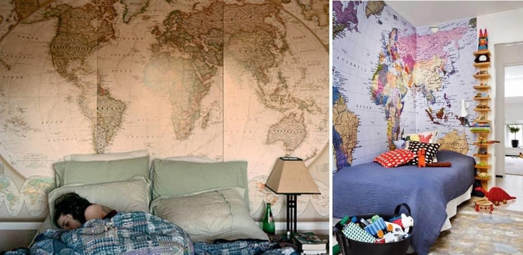 Перегородки для зонирования пространства также можно оклеить схематичными изображениями нашей планеты. Лучше всего подбирать цвета, сочетающиеся с предметами мебели или другими аксессуарами: