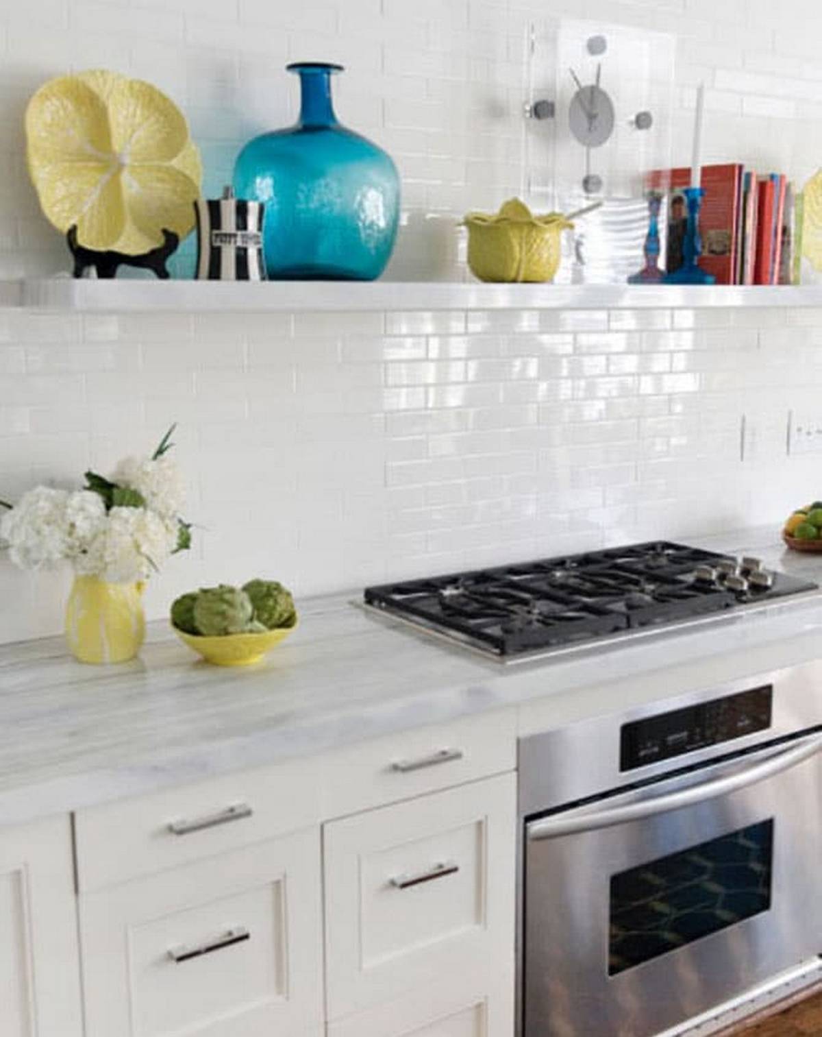 Белая плитка для кухни выглядит свежо и привлекательно. Уместна не только в качестве настенного покрытия. Такая плитка подойдет и для пола. Белая поверхность обладает хорошей светоотражающей способностью.
