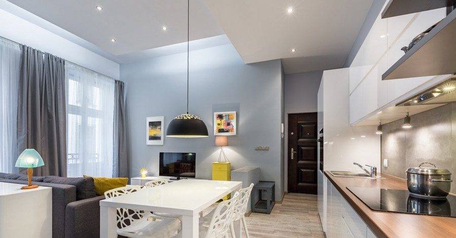 В качестве акцентов можно сделать яркий кухонный гарнитур или повесить плотные шторы в том же оттенке. Вариантов оформления красивого помещения очень много.
