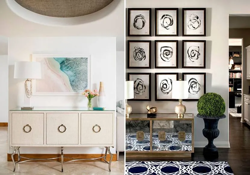 Подобный декор часто занимает пространство над предметами мебели (тумба, комод, консоль, диванчик). Это может быть небольшая картина или несколько меньшего размера, объединённых общей темой.