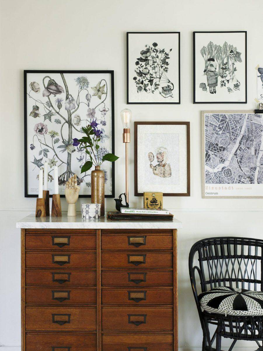 Не слишком вычурные черно-белые изделия в строгих рамках или ретро-зарисовки с белоснежным паспарту, будут прекрасно сочетаться со сдержанным скандинавским стилем.
