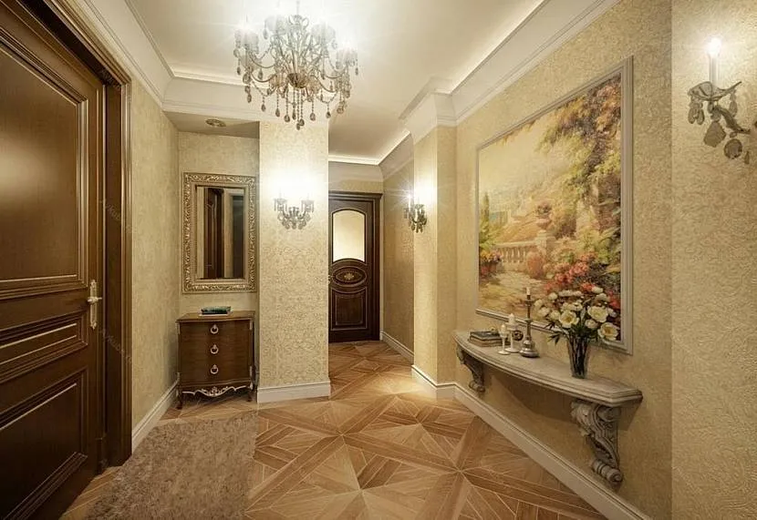 Фреска. Классические фрески создавались по строго определенной технологии — наносились на сырую штукатурку. Сегодня под ней понимают настенную живопись красками, нанесенную разными способами (кисть, аэрограф). Для прихожих, как помещений темных, подходят фрески в светлых оттенках. Материал изображения должен быть достаточно прочным, чтобы выдерживать регулярный уход.