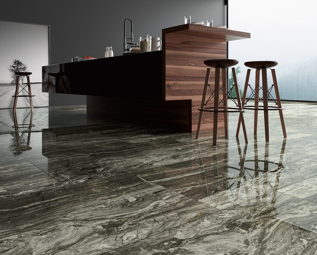 - Полированный керамический гранит. Такая плитка имеет зеркальный блеск и выглядит очень эффектно, но ввиду сложности и длительности процесса полировки она дороже матового камня. С течением времени по мере истирания тонкий глянцевый слой грубеет и становится матовым. Этот процесс сопровождается открытием пор материала, до того времени закрытых полировкой. В них попадают загрязнения, поэтому при изготовлении полированный керамический гранит покрывают лаком. Нередко эта процедура отсутствует. В таких случаях сразу после облицовки пола керамогранитом рекомендуется покрыть его воском, лаком и т.п.