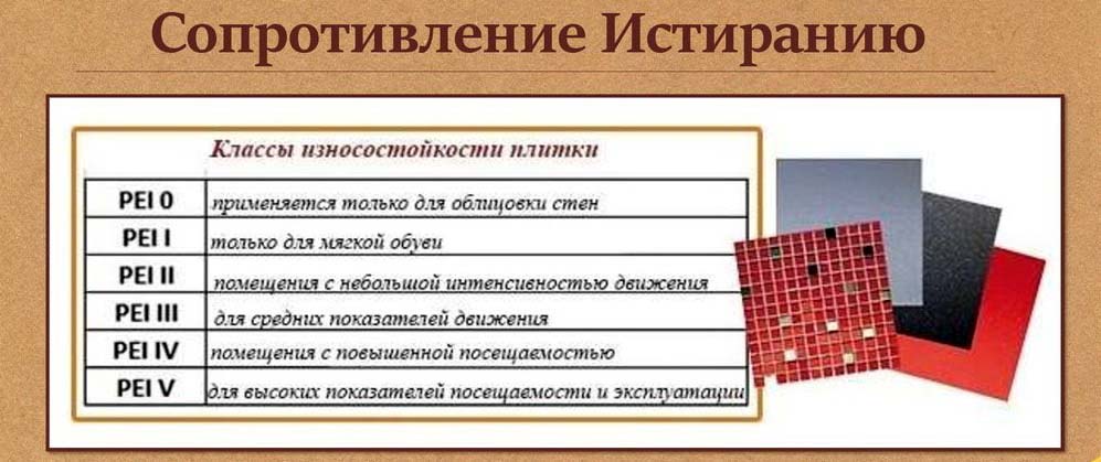 - PEI III – след от трения ролика отсутствует после 1500 оборотов. Таким керамогранитом отделывают полы в прихожих, верандах загородных домов, и для полового покрытия в офисах;