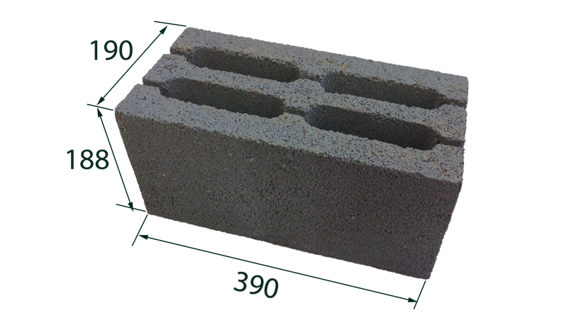 Стандартный четырехщелевой керамзитобетонный блок – это востребованный материал, объем которого равен 4 полнотелым керамическим кирпичам. Показатель способствует уменьшению весовой нагрузки на фундамент при повышении оперативности выкладки. Технические характеристики стандартного продукта: