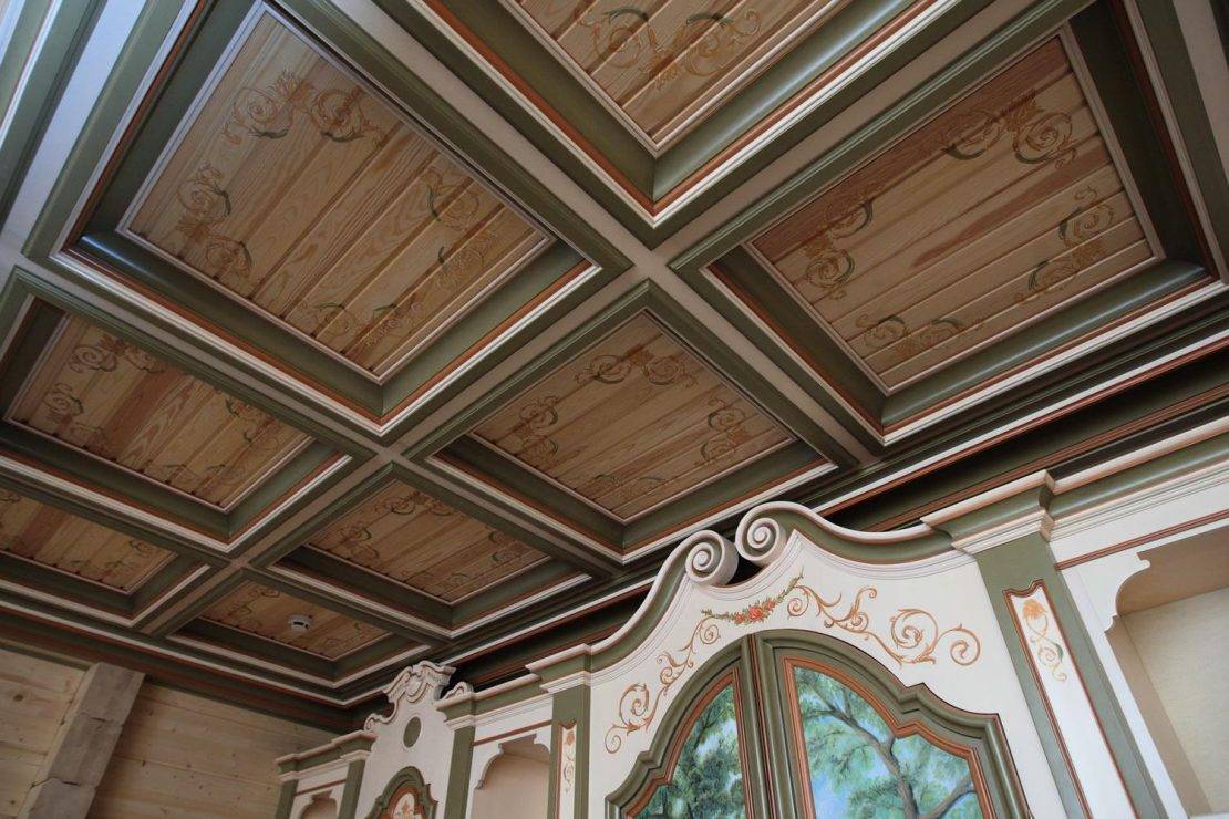 Кессонный потолок состоит из ниш в потолке, которые образуются при пересечении балок. Часто секции имеют форму прямоугольника или квадрата, но допустимы ячейки другой геометрической или свободной формы. Кессоны, в зависимости от материала изготовления, могут быть декорированы любым способом, но чаще всего – это художественная резьба или лепнина.