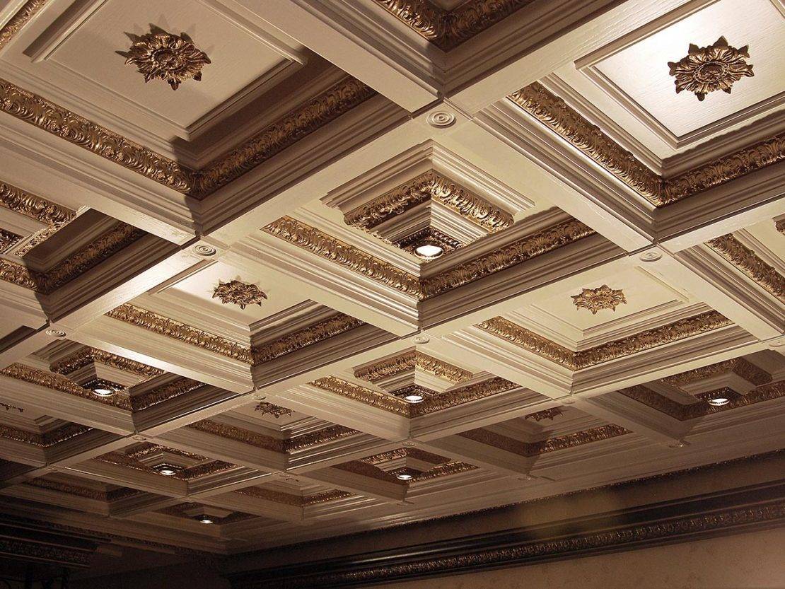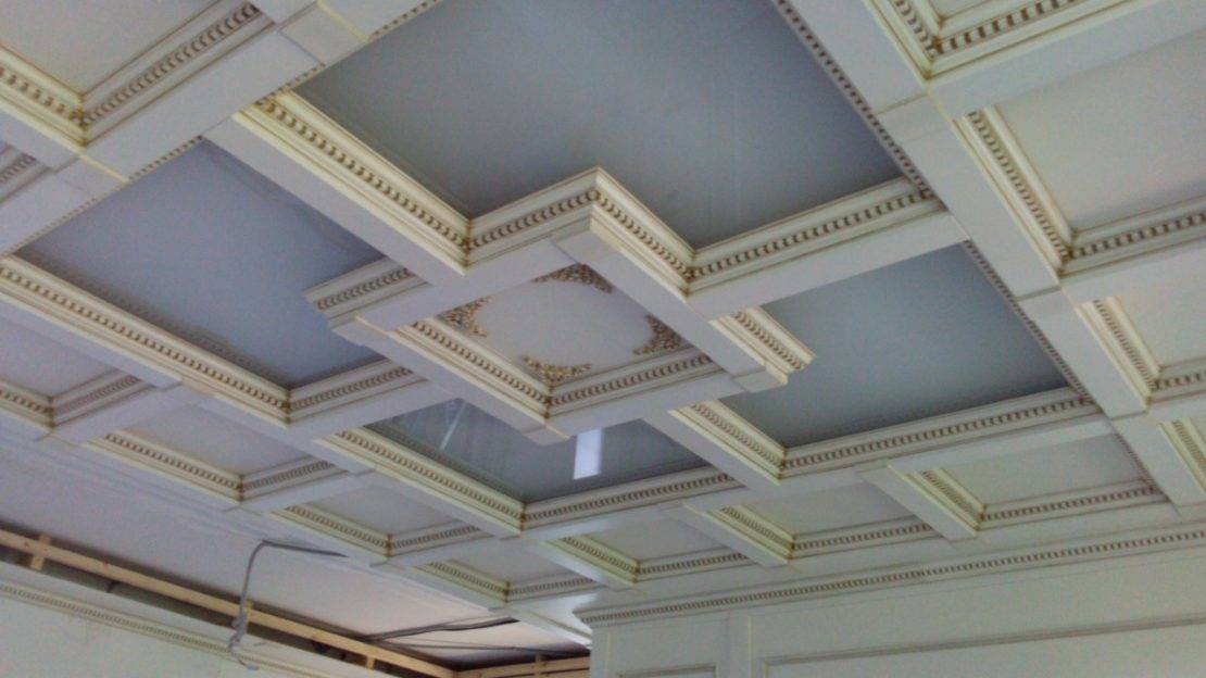 Из полиуретана. Главные преимущества кессонов из полиуретана — они легкие, долговечные, не дорогие, не нуждаются в особом уходе. Их можно красить, а также тонировать с эффектом патины или позолоты. Кессоны из полиуретана улучшают акустику помещения, их монтируют в подвесной гипсокартонный потолок, иногда в сочетании с подсветкой.