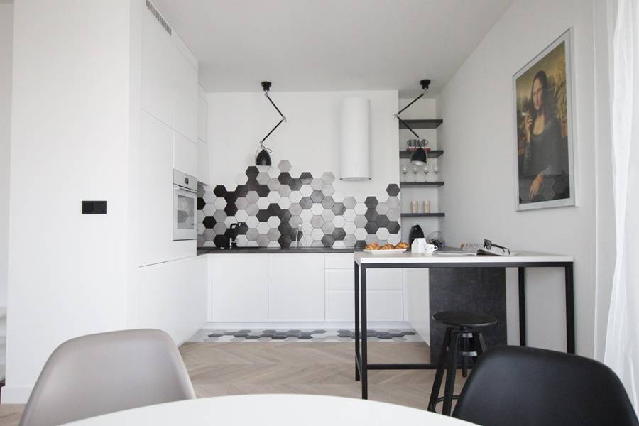 - На небольших кухнях не используйте большие плитки, которые визуально уменьшат комнату; в небольших помещениях лучше всего выглядят маленькие или квадратные плитки; чтобы оптически увеличить комнату, стоит использовать стеклянную плитку или зеркальную плитку в кафеле; мозаичная также подойдет для маленькой кухни;
