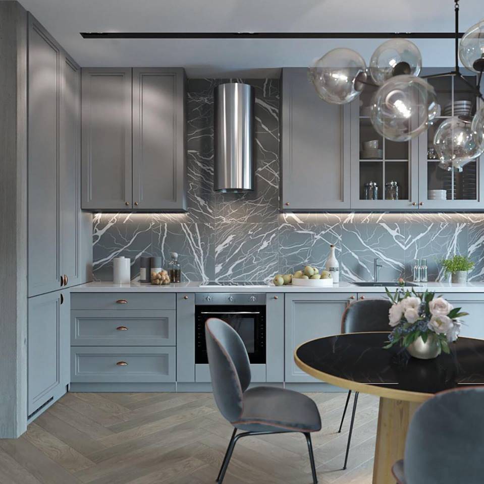 Серо-голубой цвет добавляет элегантности очаровательной эклектичной кухне в дизайне от Tal Goldstein
