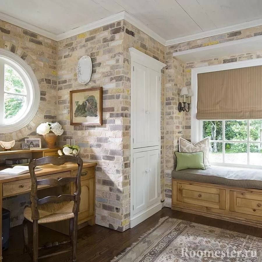 Романтичная стилистика прованс или деревенский кантри прекрасно подходят для оформления кирпичом. Здесь уместно использование искусственно состаренного отделочного материала в более светлой гамме, добавляющей помещению света и простора.