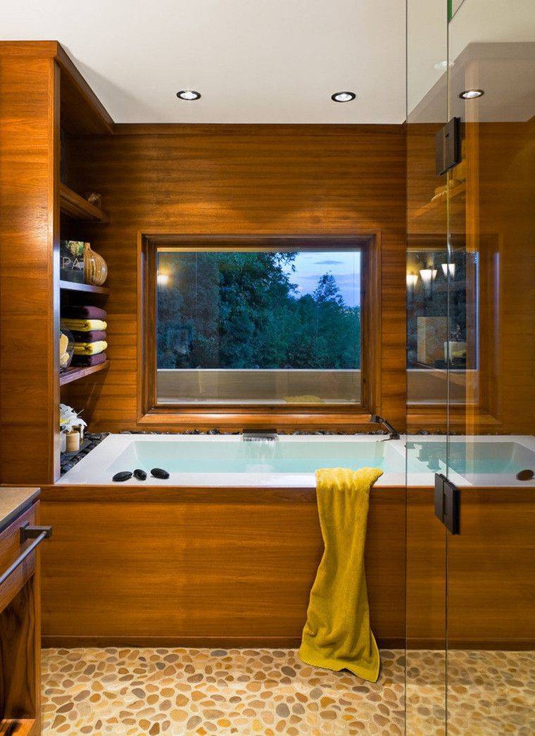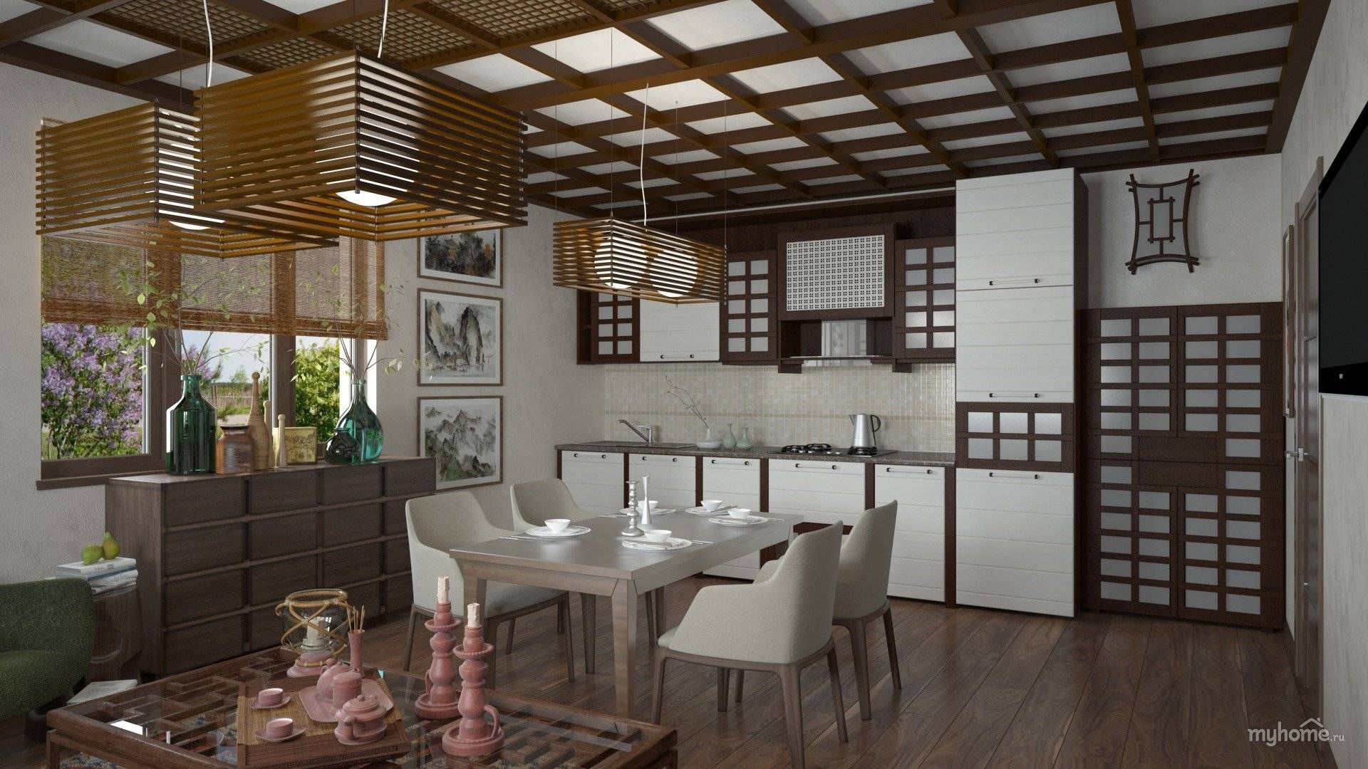 единение с природой — в традиционном японском загородном доме пейзаж является прямым продолжением и дополнением интерьера, поэтому стены, выходящие на террасу, делают раздвижными. При отделке квартиры японцы отдают исключительное предпочтение натуральным и натуральным материалам, используя дерево вместо камня. Вместо массивных стен — легкие перегородки или ширмы из бамбуковой или рисовой бумаги. Пол деревянный, такой же надежный и прочный бамбук, стены обшиты деревянными панелями, шторы исключительно натуральные, из льна или шелка.