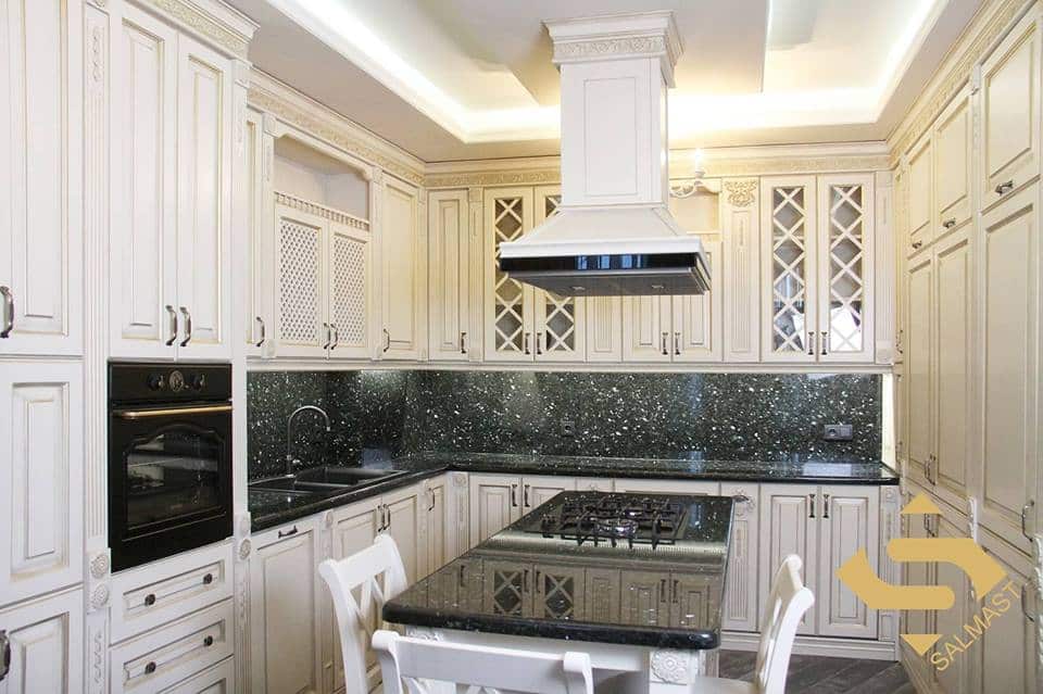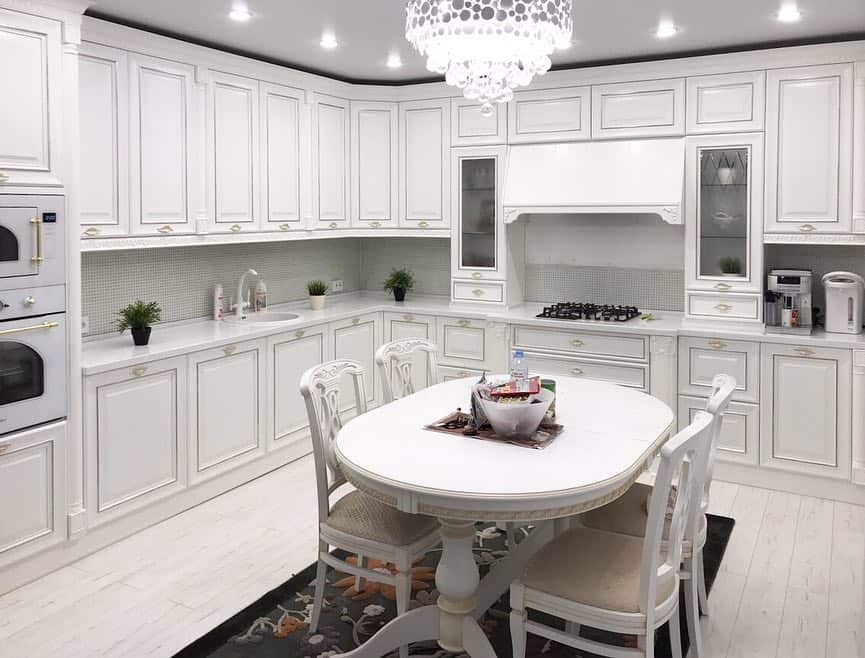 Белая классическая кухня – выражает статусность, наличие вкуса у владельцев. Это зрительное расширение пространства и богатство интерьера. Здесь чаще используют теплые оттенки белого: топленое молоко, высветленный дуб, которые идеально сочетаются с пудрово-розовым, песочным или фисташковым цветами.