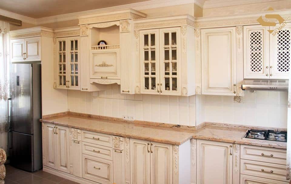 - Не менее популярной является бежевая кухня. Ее также можно оттенить более темной столешницей или позолотой на деталях: патина или золоченая краска покрывает ручки, фасады, молдинги, лепку под потолком. Бежевая палитра широко используется в основной отделке (такой проект вы сможете встретить довольно часто): выбрать в цвете беж можно стилизованные фотообои, МДФ фасады, отделку вытяжки, шторы, люстры и другие детали из светлого массива дерева.