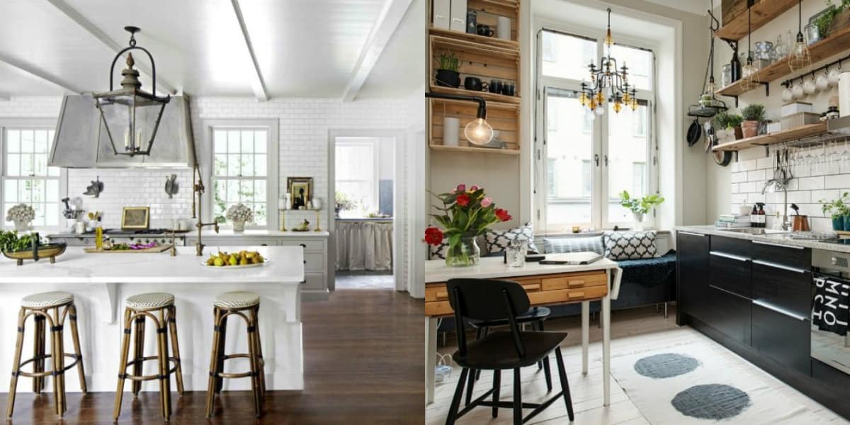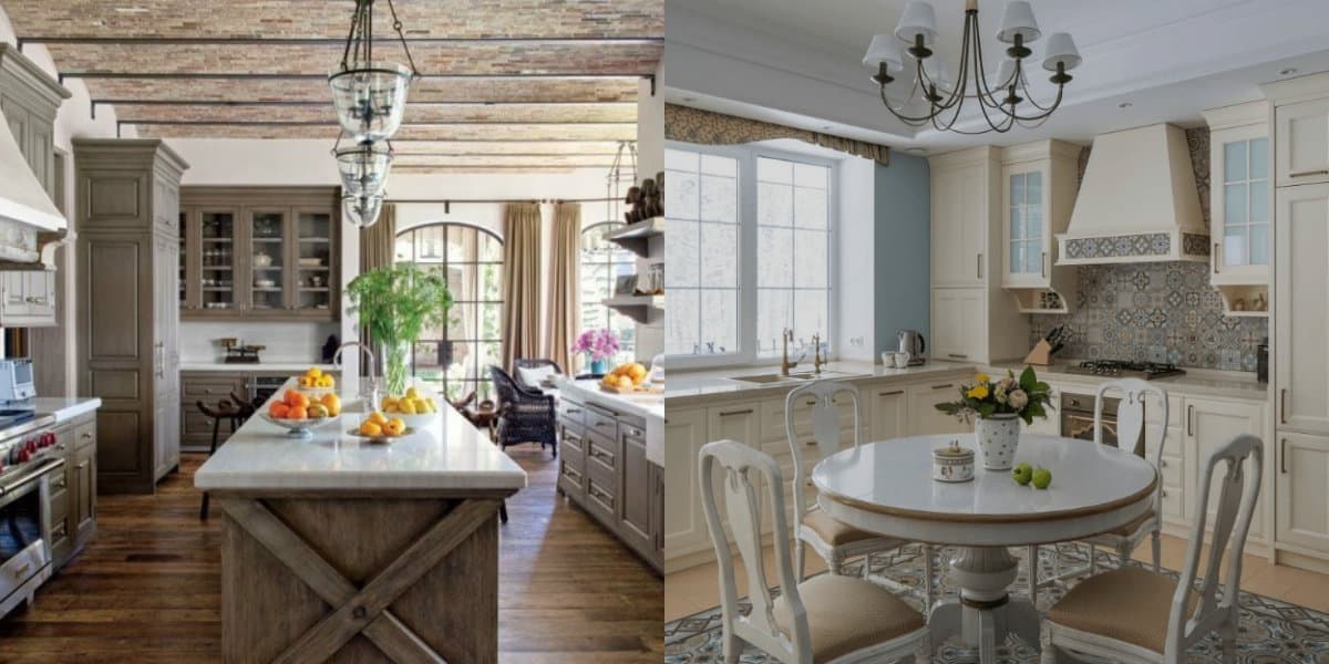 Этот стиль является более изящным. Для него характерно использование натуральных материалов: дерево, керамика, стекло. Кухонный гарнитур может иметь резные фасады и винтажную фурнитуру. Также приветствуется большое количество декоративных элементов: миленькие горшочки с цветами, винтажные люстры, цветастые занавески. Резные стулья для обеденного стола тоже будут очень кстати для такого интерьера.