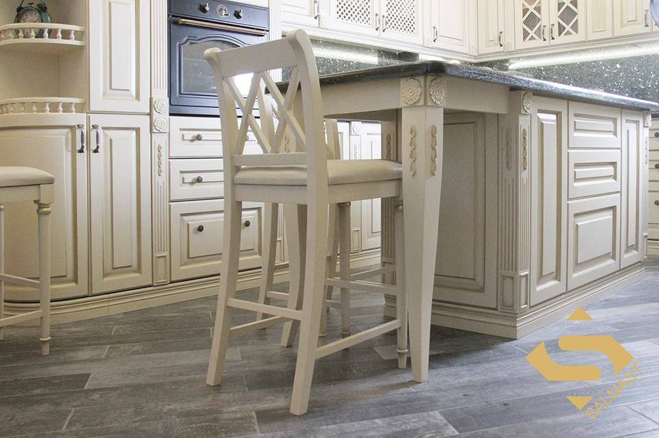 Хорошо смотрятся массивные круглые, овальные или квадратные столы на крупных резных ножках и с таким же резным декором. Их дополняют обеденные стулья, обитые кожей, бархатом или жаккардом. Более современные интерпретации позволяют заменить обеденную зону на высокую и широкую барную стойку, примыкающую к гарнитуру.