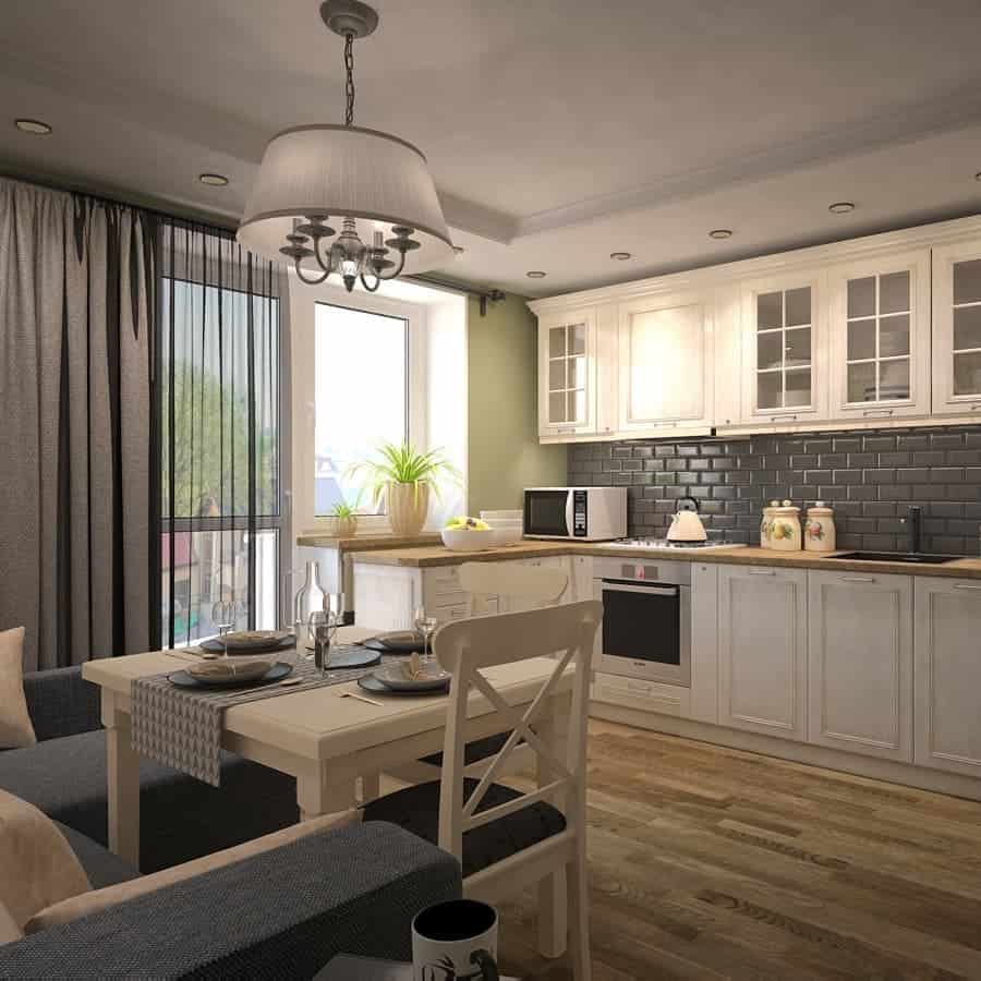 Такая кухня придется по душе практически всем. В данном стиле все сдержано, но не строго. Отлично впишется кухонный гарнитур из массива в светлом цвете с классической фурнитурой. Для освещения можно подобрать «хрустальную» люстру. Обеденная группа должна быть выполнена из тех же материалов, что и кухонных гарнитур. В качестве декора можно использовать вазу с цветами, фарфоровую посуду в серванте или шторы из легких материалов.