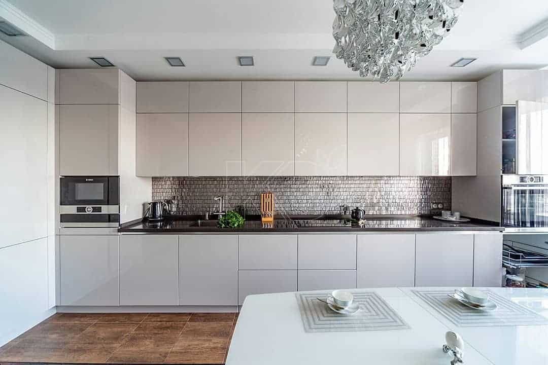 - Итак, чаще всего основным остается белый цвет. Его оттеняет пол темных тонов, который может быть белесым, но чаще всего это покрытие имеет фактурный дизайн или теплый древесный оттенок. Белым может быть все: фасады из МДФ, вытяжка из кирпича, эмалированные ручки, однотонные или с узором обои, тяжелые шторы, хрустальные люстры, угловые гарнитуры или прямая мебель для любой зоны, элитные конструкции с подсветкой на потолке. Это описание может быть бесконечным.