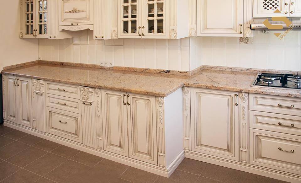 Очень часто на кухням в стиле «классика» используется натуральный мрамор в качестве напольного покрытия