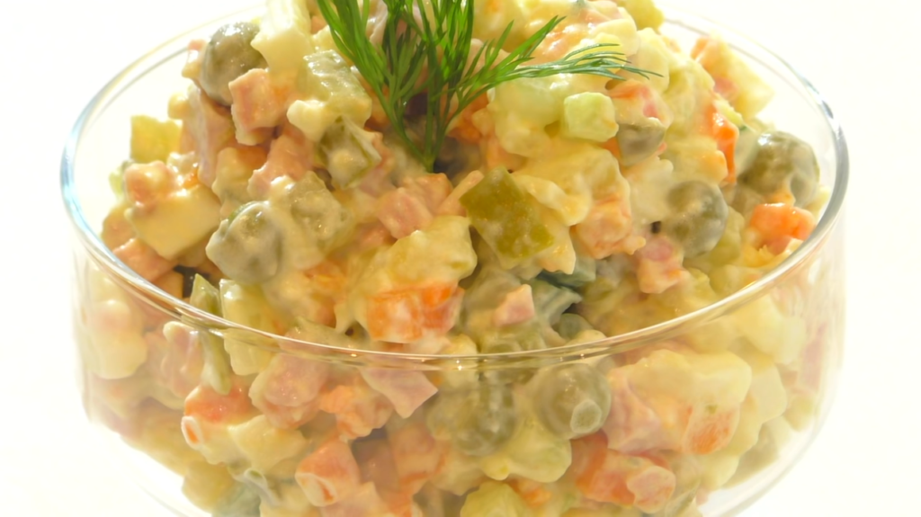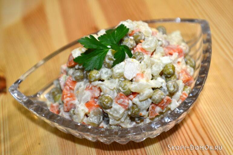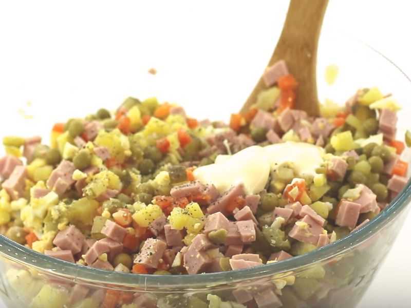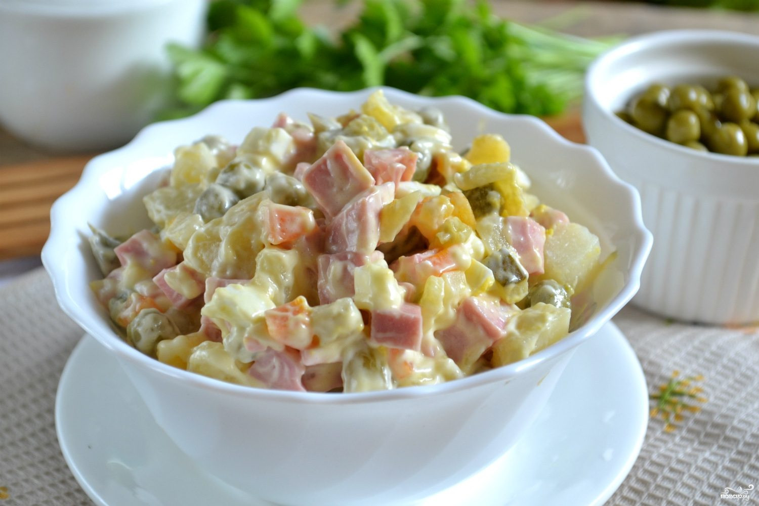 Классический салат Оливье с вареной колбасой и солеными огурцами