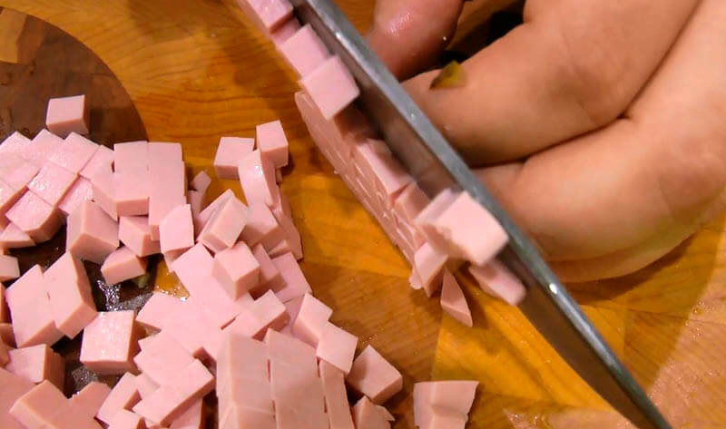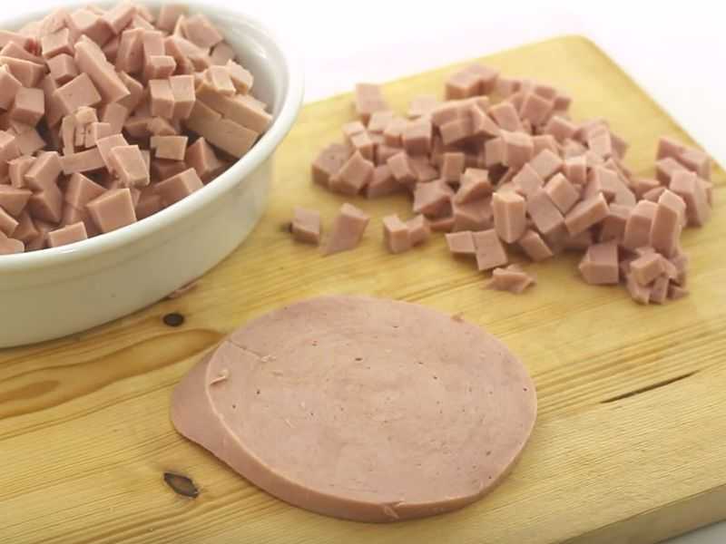 Колбасу для салата берем вареную. Сорт может быть любой: любительская, с дымком, вареная ветчина, кто как любит. Выберите свой любимый продукт. Я предпочитаю молочную ГОСТовскую колбасу. Нарезаем ее кубиком среднего размера, вот так: