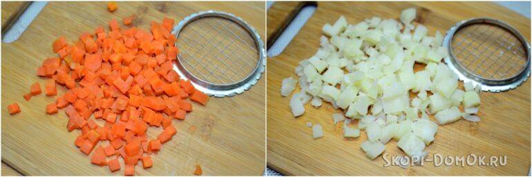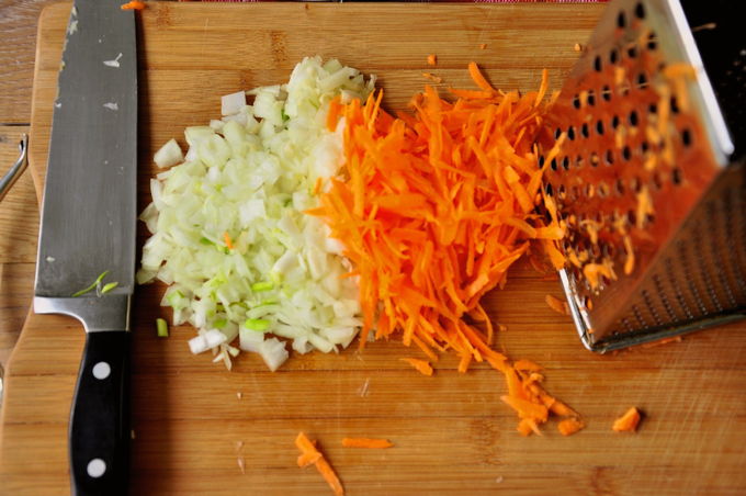 1. Чисти луковицу и морковку. Лук нарезаем на кусочки, а морковку измельчаем на крупную терку.
