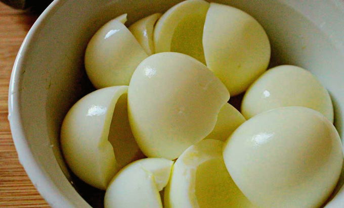 Отвариваем яйца в подсоленной воде. Воду подсаливаем для того, чтобы яйца не лопнули в процессе варки, далее остужаем в воде холодной, очищаем от скорлупы.