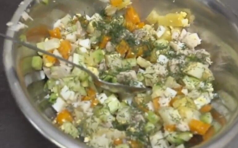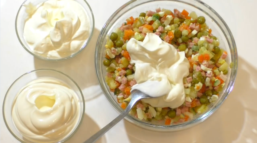 Если вы приготовили много салата, то весь заправлять майонезом не стоит. Иначе он быстро испортится. Лучше это делать небольшими частями сразу перед подачей.