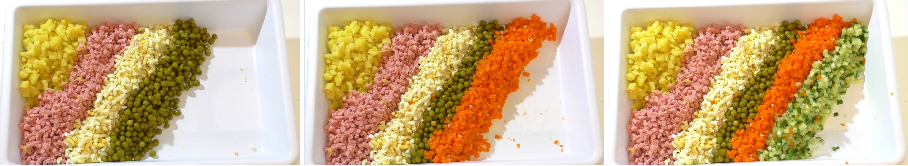 3. Яйца, отварные овощи измельчаем при помощи овощерезки на мелкие кубики. Можно и просто порезать ножом. Складываем сразу в салатник.