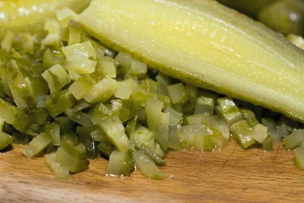 У маринованных огурцов обрезаем кончики. Нарезаем их средними или мелкими кубиками, в зависимости от Ваших предпочтений. Кладем в миску с горошком.