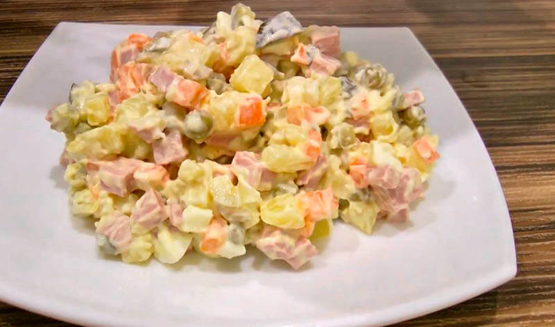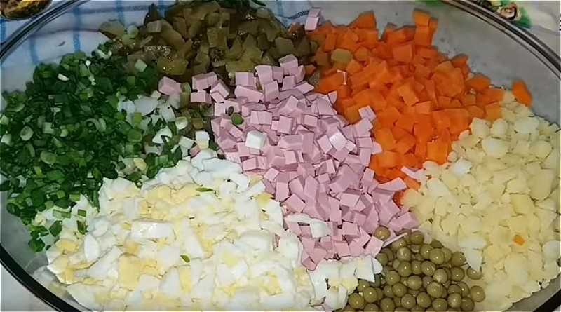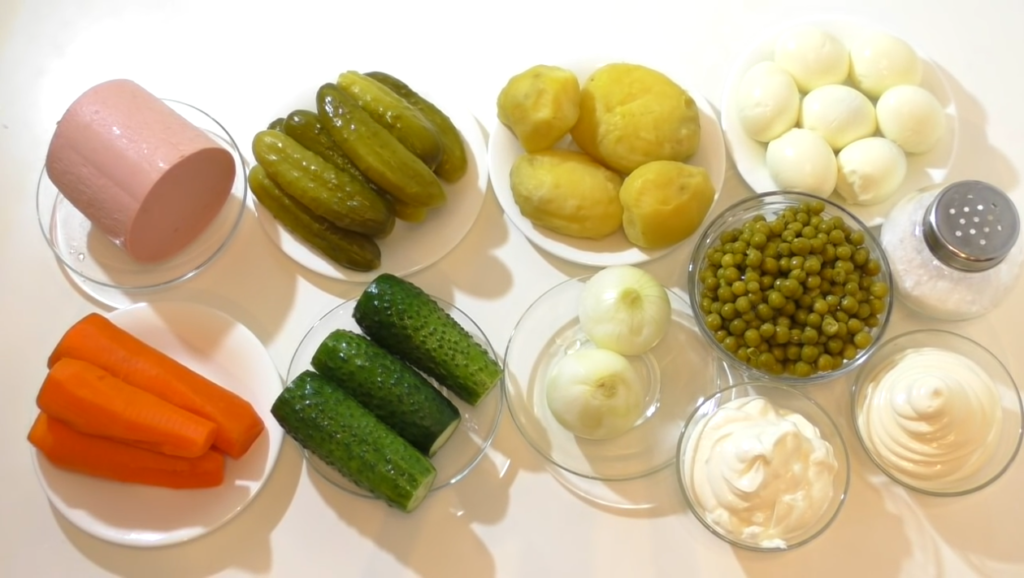 Салат Оливье классический с колбасой и соленым огурцом + ингредиенты салата
