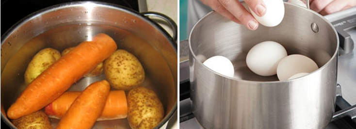 Смотрите, суть самого процесса не меняется, самое важное, все отварить и остудить. Итак, отваривать нужно морковку, яйца и картошку
