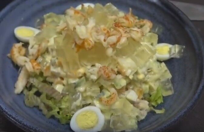 14. Смешиваем все продукты. Солим и приправляем салат, заправляем его майонезом. По бокам украшаем салат чашечками с желе.
