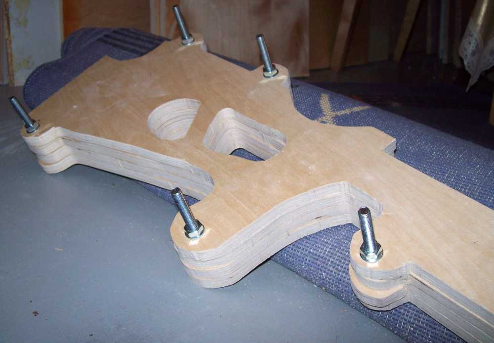 В его верхней и нижней части делают отверстия с резьбой и в упор фиксируют склеиваемые заготовки болтами через прокладку. Шаг болтов должен соответствовать 10 толщинам заготовок. Прокладки между болтами и фанерой должны составлять 3 толщины деталей. Края швеллеров соединяют болтами через бобышки. Запрессовка производится равномерно, со средней затяжкой, чтобы в шве оставалось достаточно клея.