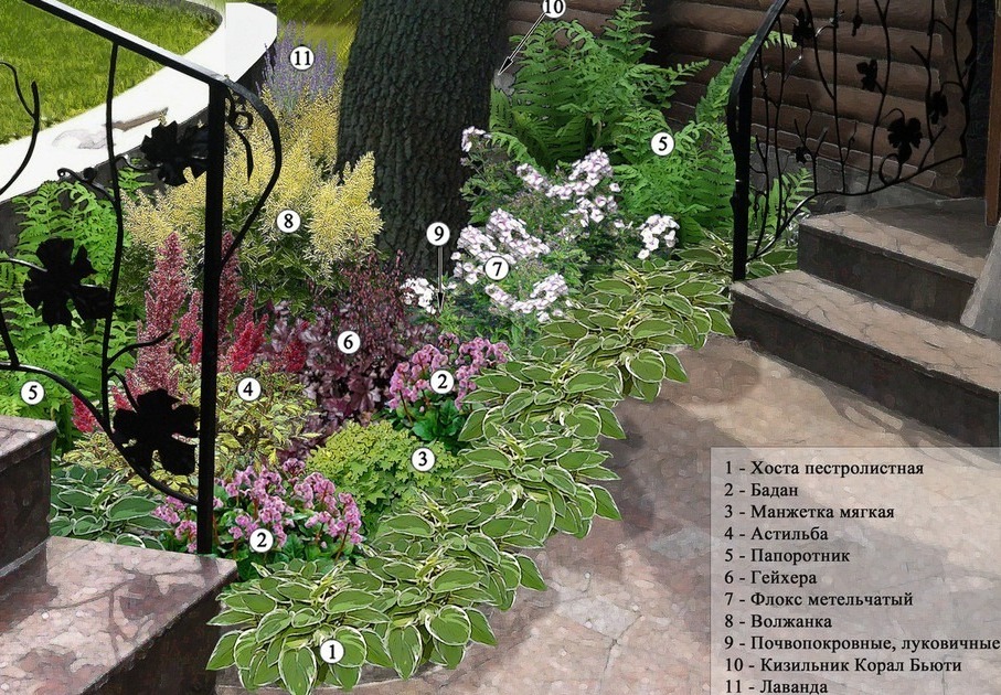 У ограды из штакетника высаживают высокорослые растения, вроде мальвы, лианы, гортензии. По периметру размещают средне- и низкорослые тенелюбивые цветы. Садоводы часто используют петунию, лобелию и бархатцы. Также принято высаживать и небольшие кустарники, вроде малины, сирени или жимолости.