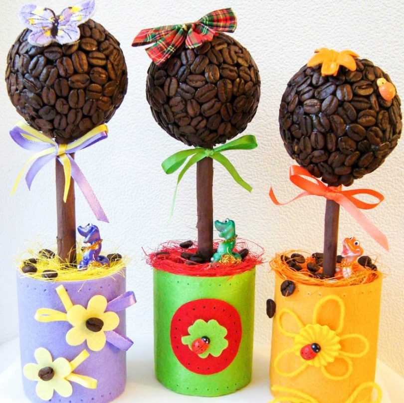 Не нужно боятся проводить эксперименты и выражать свою фантазию, когда будете делать кофейное дерево. Имеется множество различных вариантов топиариев, приведем некоторые стильные идеи для изделий.