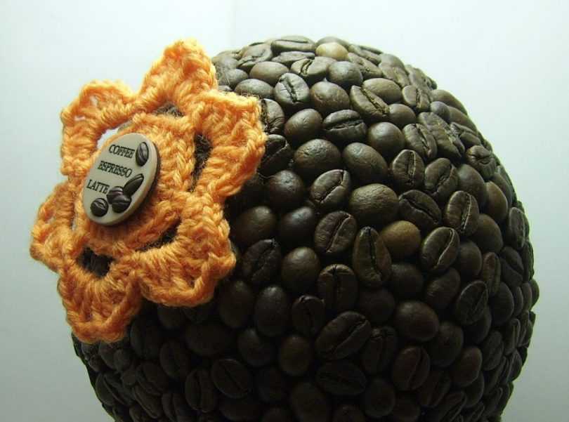 Это не очень топиарий, но делают кофейный шар подобным методом. Отличие состоит в отсутствии ствола, да и по форме он абсолютно не напомнит дерево. Можно сочетать в композиции зерна кофе с семечками, бобовыми. Стильный вариант выйдет, если расположить несколько шаров в привлекательном стеклянном блюде или вазе.