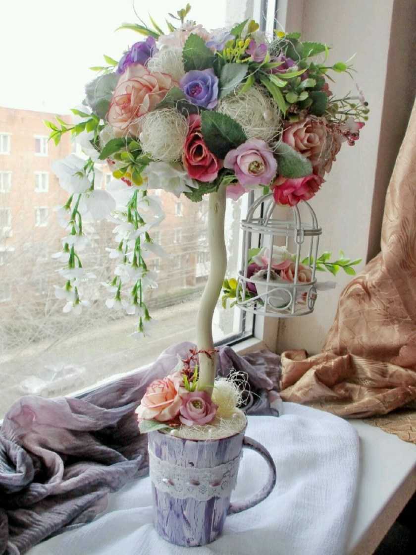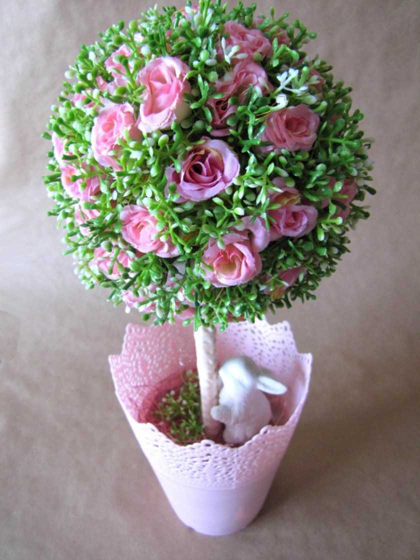 Деревце с нежными цветами станет великолепным сюрпризом для презента на восьмое Марта, День рождение и др. Более того, такой топиарий можно поставить в гостевой или спальной комнате.