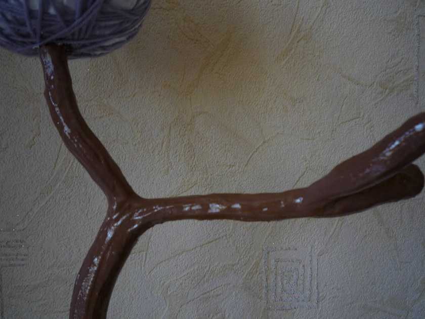 Подготовленный ствол крепим пластилином ко дну чашки, заранее спланировав, где будет крона. Обратный конец заостряем, чтобы упростить последующую фиксацию шара.
