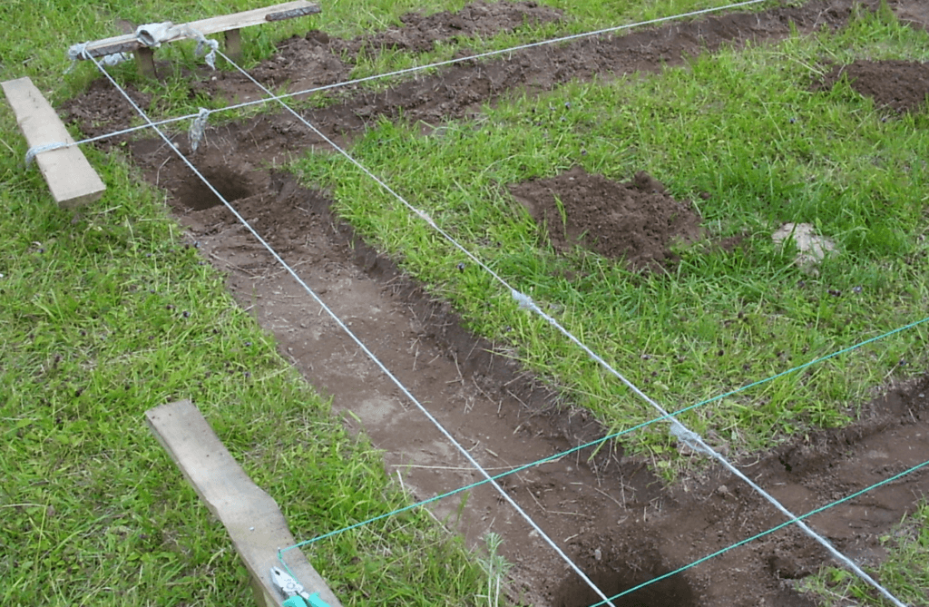 Когда мусор удален, грунт выровнен, надо выкопать ямы. Поскольку их глубина невелика, сделать ямы можно и самому обычной штыковой лопатой.