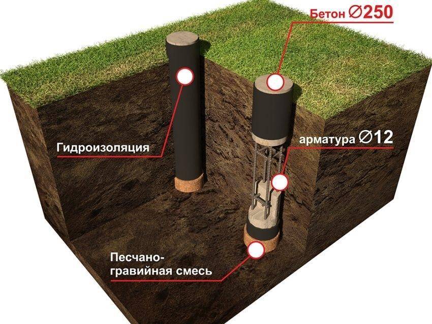 При возведении бетонного фундамента в местах опор выкапываются колодцы нужной глубины, на песчаную подушку устанавливается каркас из арматуры, и получившуюся конструкцию заливают бетоном. Для надземной части столба сооружают опалубку.