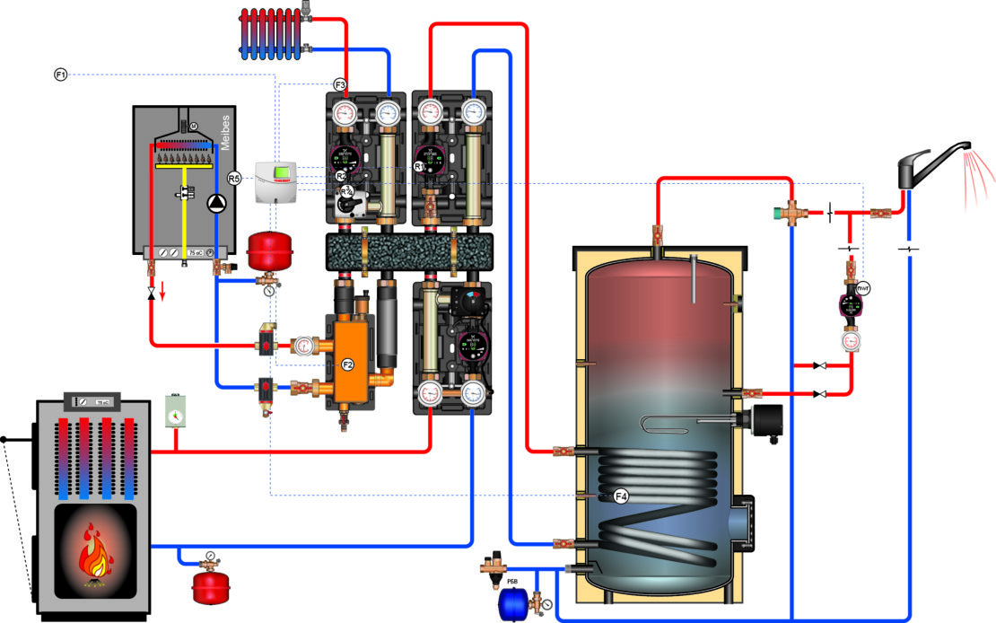 Рабочий процесс выглядит примерно так: котел с дровяным отоплением соединен цепью с электронагревательным котлом. Электрический котел используется не постоянно. Аппарат остается в резерве – готов к подключению, после остывания системы. После того как в топочном отсеке заканчивается топливо и теплоноситель опустится до температуры 45 градусов. Необходимым условием данной схемы является бойлер.